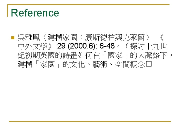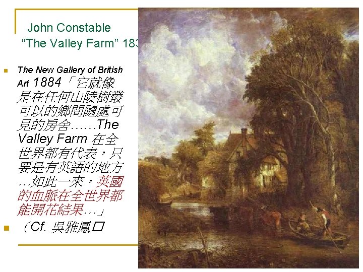 John Constable “The Cornfield” 1826 n n n Apparently realistic only, but actually not about harvest; e. g. sheep not sheared; dog in the wrong direction; only two workers; The actual focus: the boy (Cf. 吳雅 鳳)