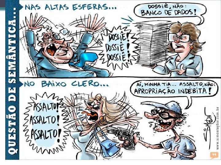 Ampliando a definição de semântica • Morris(1938) – “o estudo das relações entre signos e objetos aos quais tais signos são aplicáveis” – Semântica Formal. • Semântica da Enunciação ou Textual. • Semântica Cognitiva – Metáfora Conceitual.