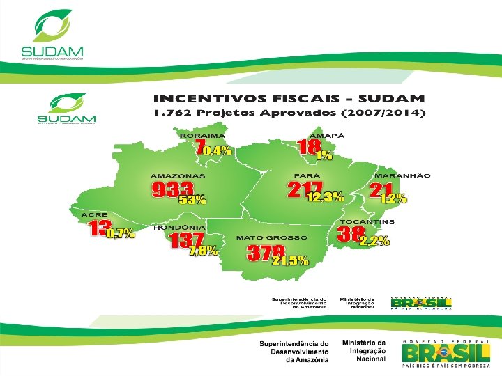 A SUDAM Criada pela Lei Complementar no. 124/2007 de 03 de janeiro de 2007. Finalidade – Art. 3 o A Sudam tem por finalidade promover o desenvolvimento includente e sustentável de sua área de atuação e a integração competitiva da base produtiva regional na economia nacional e internacional. Objetivo • Formular planos e propor diretrizes para o desenvolvimento de sua área de atuação, em consonância com a política nacional de desenvolvimento regional, articulando-os com os planos nacionais, estaduais e locais;