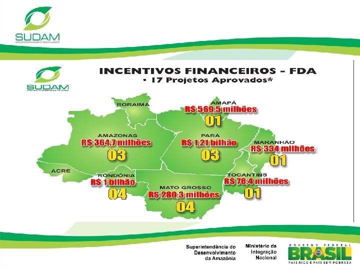 Infraestrutura e recursos alavancados RELAÇÃO PERCENTUAL PROJETOS DE INFRAESTRUTURA X OUTROS SETORES SETOR INFRAESTRUTURA OUTROS SETORES TOTAL % 82. 69% 17, 31% 100, 00% RECURSOS ALAVANCADOS RECURSOS FDA R$3, 92 BILHÕES RECURSOS PRÓPRIOS OUTRAS FONTES TOTAL DE RECURSOS ALAVANCADOS R$6, 91 BILHÕES R$10, 06 BILHÕES R$16, 97 BILHÕES 1 – Infraestrutura – 13 Projetos / 11 Implantados 2 – Outros setores – 04 Projetos / 03 Implantados TOTAL = 17 Projetos