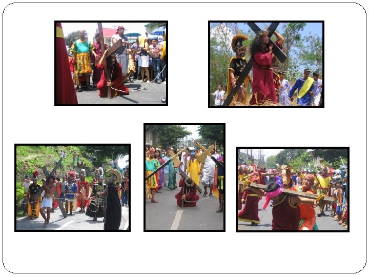 Senakulo �Senakulo is when a communtiy comes together to reenact Jesus’ life especially his sufferings. �In Morong, Rizal the Senakulo is held within 2 days starting from Holy Thursday until the end of Good Friday. �The Senakulo involves real crucifiction and real sufferings for the people think this is a form of penance, however, this is not encouraged. �The Senakulo has become a tourist attraction because of its uniqueness, authenticity & passion.
