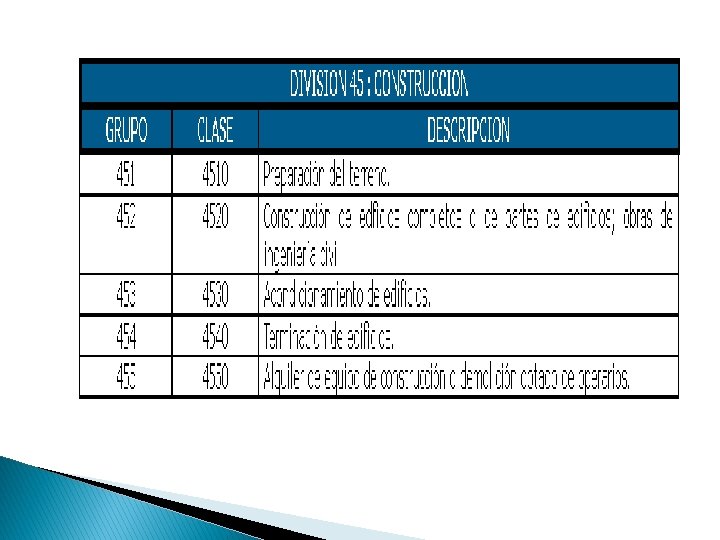 � Clase 4510: Preparación del terreno. - � Esta clase incluye algunos conceptos que parecieran entrar en contradicción con el significado del término “construcción”, ya que se consideran las labores de demolición y el derribo de edificios y otras estructuras. También se consideran dentro de esta clase a la venta de materiales procedentes de estructuras demolidas. � Asimismo, están incluidas las actividades de voladura, perforación de prueba, nivelación, movimiento de tierras, excavación, drenaje y demás actividades de preparación del terreno.