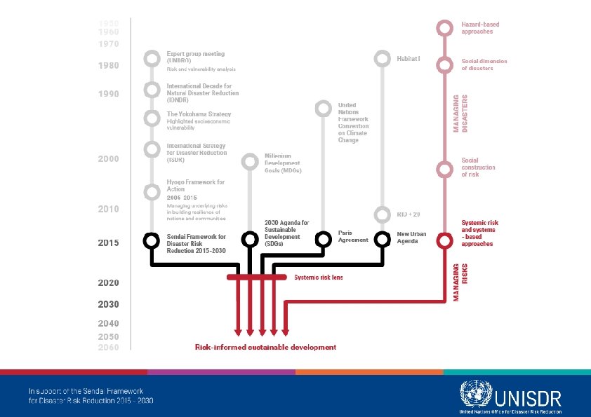 Sendai Framework for Disaster Risk Reduction • Successor framework to the Hyogo Framework for Action • Covers 2015 -2030 • Adopted by United Nations General Assembly • Expanded scope of risk • Defines the mandate of the UN Office for Disaster Risk Reduction - Periodic reviews of progress - Supporting indicator development - Generating evidence-based guidance - Supporting development of Standards - Etc.