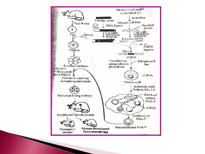 RETROVIRAL METHOD � Introduction of foreign DNA into eggs with the help of a retrovirus vector is called RETROVIRAL METHOD. � Small foreign genes. Less than 8 kbp can be transferred to recipient cells through retrovirus vectors. � MURINE LEUKAEMIA VIRUS is the most common retrovirus being used to introduce genes into animals cells.