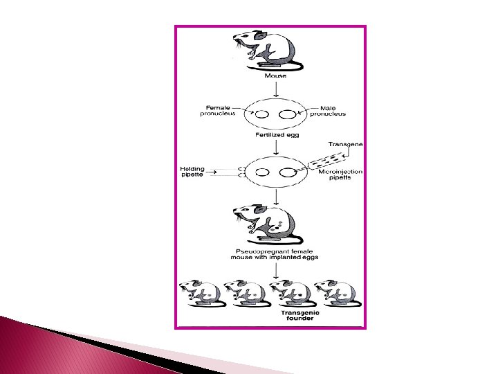 Ø The foreign gene is microinjected in to the male pronucleus of the eggs with the help of a micropipette. Ø About 25 -40 microinjected eggs are implanted in the uterus of a a foster mother and the female is then mated with a vasectomized male. This mating brings up a pseudopregnant condition for the further development of the eggs in the uterus. Ø The foster mother will give birth to trangenic pups. Ø Transgenic pups can be screened by southern blotting. DNA isolated from small piece of tail is hybridized with known probe to detect the transgenic mice.