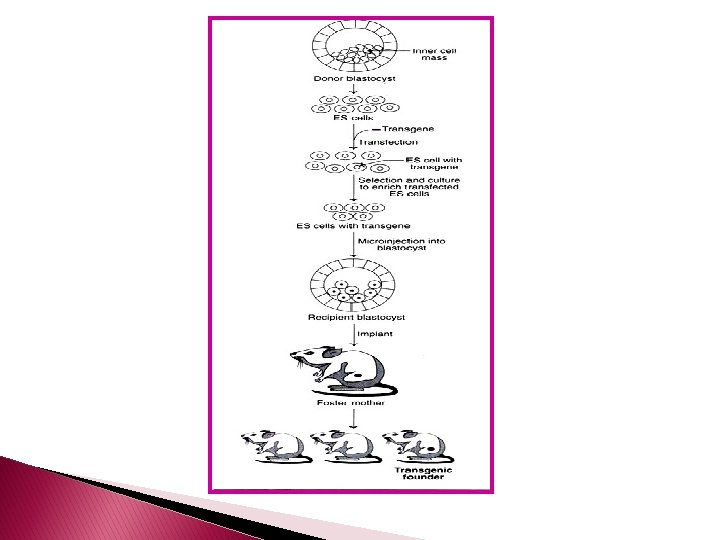 After transfection, the embryonic stem cells in the tube are transferred to a medium containing neomycin. Recombinant ES cells alone grow in the medium and the others die. q The ES cells forming colonies are picked up from the medium and grown in vitro to get more number of recombinant ES cells. q The recombinant ES cells are microinjected into fresh blastocysts taken from mice. q The microinjected blastocysts are implanted into a foster mother and the mouse is mated with a vasectomised male. q The foster mother, 3 weeks after implantation , delivers transgenic pups. q Transgenic pups are screened by using southern blotting. q