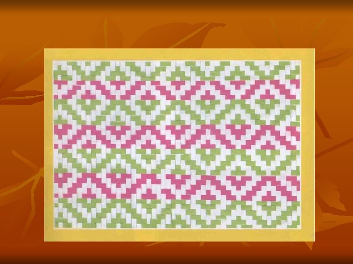 ANYAMAN n n Mengayam ialah proses menjalin helaian atau jaluran daun mengkuang atau daun pandan yang telah diproses mengikut disiplin tertentu Seni anyaman ini telah terkenal sejak zaman dahulu lagi dalam masyarakat melayu terutamanya di Terengganu, Kedah, Perak dan Melaka.