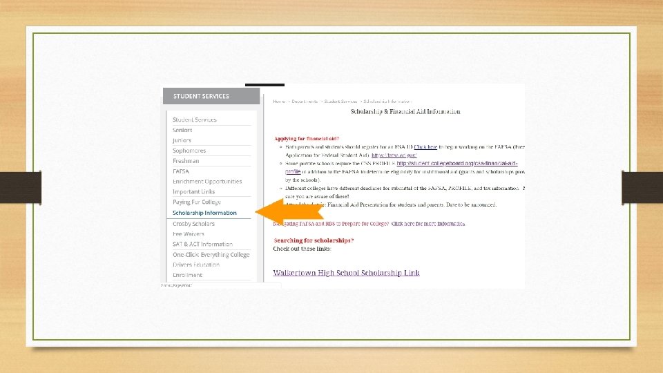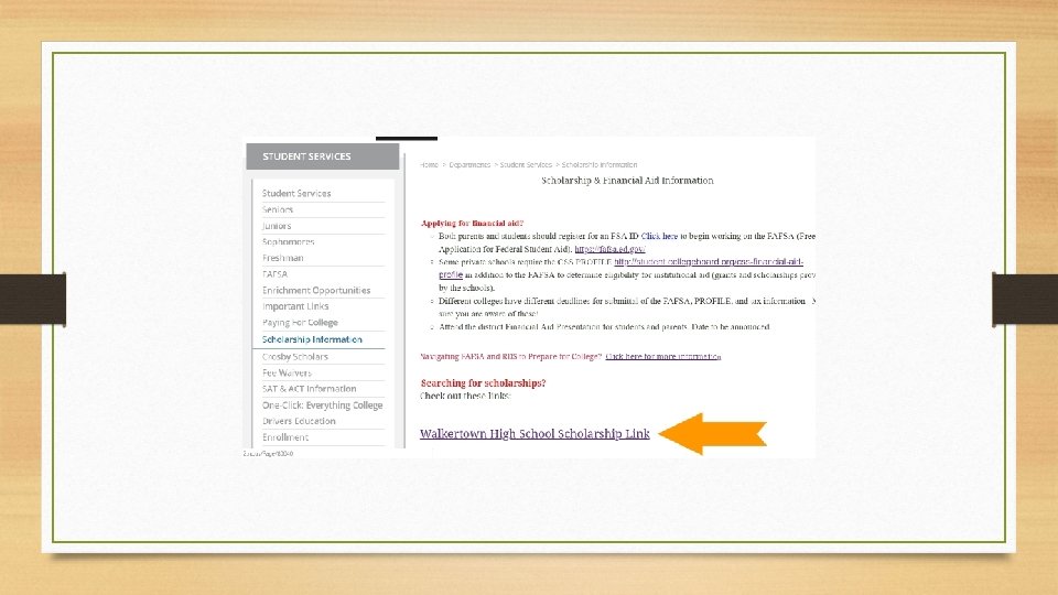 Scholarship searches • • Beware of paying for scholarship searches (lots of scams out there!) www. cfnc. org www. fastweb. com www. scholarships. com www. collegeboard. com www. nationalservice. gov College & University websites Walkertown High School website
