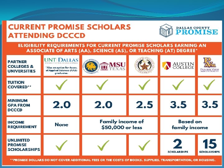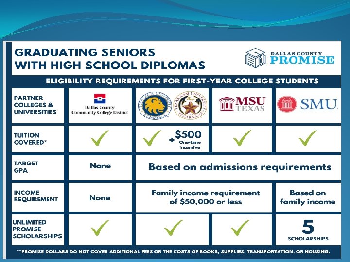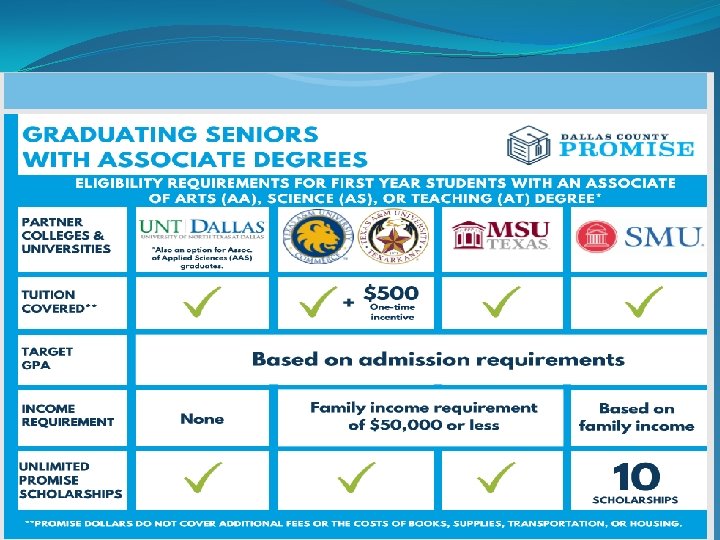 Promise Benefits to Students 1. Regardless of what FAFSA/TASFA comes back with, Promise students are guaranteed free tuition at any DCCCD campus 2. For ALL students at the 41 participating high schools regardless of income or high school GPA (and no essays!) 3. Promise Pledge also counts as DCCCD Rising Star scholarship application; students will automatically receive book stipend if they meet additional income and GPA requirements 1. 3. 0 GPA 2. Based on FAFSA application – financial need