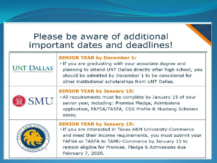 Three steps to receive free-tuition Promise & Success Coach q. Pledge SENIOR YEAR by February 7, 2020: q. Apply SENIOR YEAR by February 7, 2020: • Make your Promise Pledge at www. Dallas. County. Promise. org • Your pledge is only complete once you see a submission confirmation • Complete application to DCCCD through Apply. TX SENIOR YEAR by March 6, 2020 • Submit Free Application for Federal Student Aid (FAFSA) or Texas Application for State Financial Aid (TASFA) and list DCCCD college q. Enroll 4 SENIOR YEAR by July 31, 2020 • Complete DCCCD Registration for Fall semester