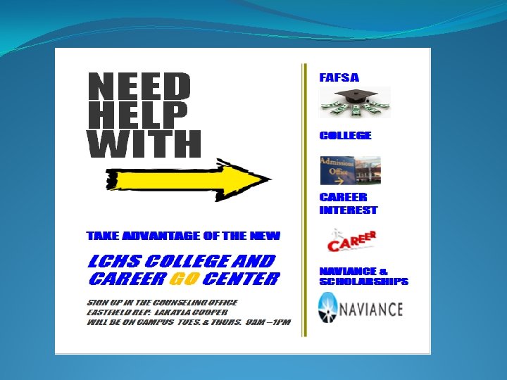 Requesting Transcripts �Transcripts can ONLY be requested through NAVIANCE. �The registrar, Mrs. Robles is the only person authorized to send transcripts…. Counselors DO NOT! �See the registrar and complete the “transcript request form” if need to be mailed. Transcripts are free if sent electronically or $1 if need to be sent via mail. �Please allow 24 - 48 hours for the transcript to be processed. �Dual Credit students – Go to DCCCD econnect account as well for your transcript.