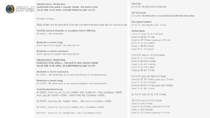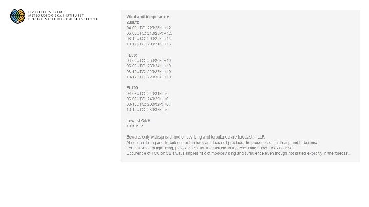 • Samat GAFOR-alueet • Tekstiennusteosa on englanninkielinen • Tuote tulee Pohjois-Euroopan yleisilmailun sääportaaliin www. northavimet. com sekä kansalliseen MET-portaaliin www. ilmailusaa. fi • Tavoitteena, että tuote olisi asiakkaiden käytettävissä syksyllä 2019