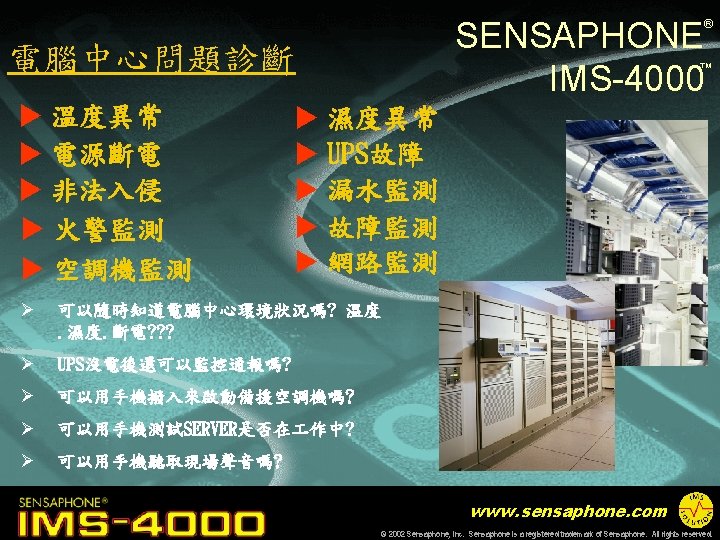 SENSAPHONE IMS 4000 電腦中心環控系統介紹 www. sensaphone. com © 2002 Sensaphone, Inc. Sensaphone is a registered trademark of Sensaphone. All rights reserved.
