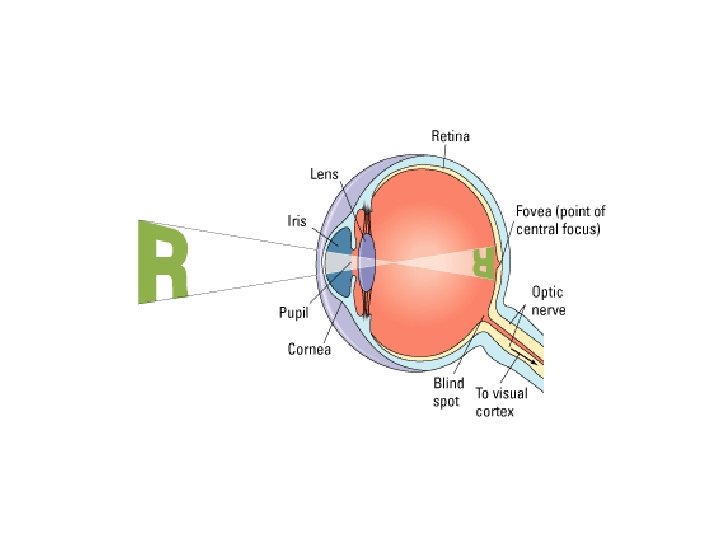 Retina, Rods, and Cones • Retina – final stop for light in the eye. Contains 3 layers: • Ganglion cells • Bipolar cells • Photoreceptors that respond to various light waves • Rods - visual sensory receptors found at the back of the retina, responsible for noncolor sensitivity to low levels of light. • Cones - visual sensory receptors found at the back of the retina, responsible for color vision and sharpness of vision.