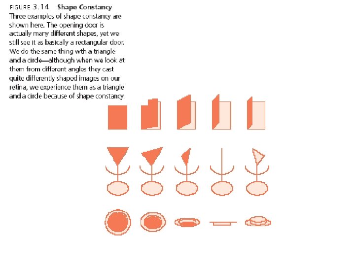 Perception and Constancies • Perception - the method by which the sensations experienced at any given moment are interpreted and organized in some meaningful fashion. • Size constancy - the tendency to interpret an object as always being the same actual size, regardless of its distance. • Shape constancy - the tendency to interpret the shape of an object as being constant, even when its shape changes on the retina. • Brightness constancy – the tendency to perceive the apparent brightness of an object as the same even when the light conditions change.