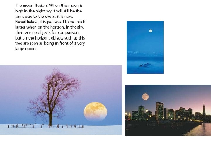Perceptual Illusions • Müller-Lyer illusion - illusion of line length that is distorted by inward-turning or outward-turning corners on the ends of the lines, causing lines of equal length to appear to be different. • Moon illusion – the moon on the horizon appears to be larger than the moon in the sky. • Apparent distance hypothesis • Illusions of Motion: • autokinetic effect - a small, stationary light in a darkened room will appear to move or drift because there are no surrounding cues to indicate that the light is not moving. • stroboscopic motion - seen in motion pictures, in which a rapid series of still pictures will appear to be in motion. • phi phenomenon – lights turned on in a sequence appear to move.