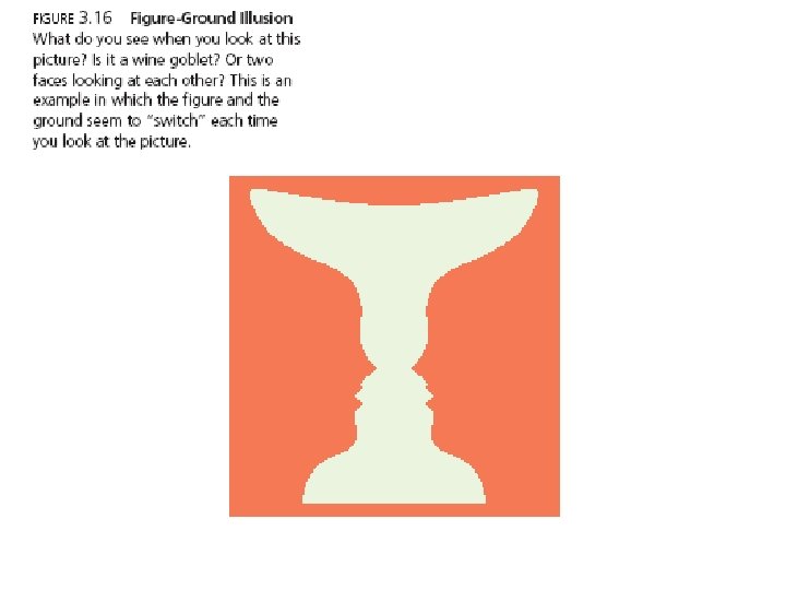 Gestalt Principles • Figure–ground - the tendency to perceive objects, or figures, as existing on a background. • Reversible figures - visual illusions in which the figure and ground can be reversed.