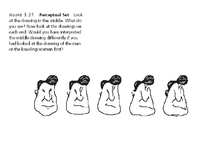 Factors that Influence Perception • Perceptual set (perceptual expectancy) - the tendency to perceive things a certain way because previous experiences or expectations influence those perceptions. • Top-down processing - the use of preexisting knowledge to organize individual features into a unified whole. • Bottom-up processing - the analysis of the smaller features to build up to a complete perception.