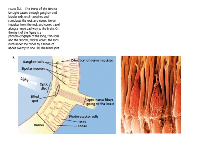 Retina, Rods, and Cones • Retina – final stop for light in the eye. Contains 3 layers: • Ganglion cells • Bipolar cells • Photoreceptors that respond to various light waves • Rods - visual sensory receptors found at the back of the retina, responsible for noncolor sensitivity to low levels of light. • Cones - visual sensory receptors found at the back of the retina, responsible for color vision and sharpness of vision.