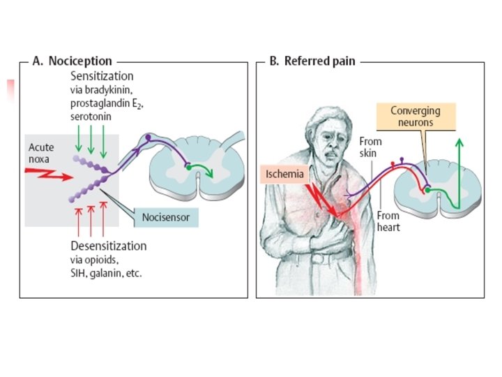 Spreading of pain information in the body n n Pain signals travel through the body along billions of special nerve cells reserved specifically for transmitting pain messages. These cells are known as nociceptors. The chemical neurotransmitters carrying the message include prostaglandins, bradykinin— the most painful substance known to humans —and a chemical known as P, which stands for pain. Prostaglandins are manufactured from fatty acids in nearly every tissue in the body. Analgesic pain relievers, such as aspirin and ibuprofen, work by inhibiting prostaglandin production.