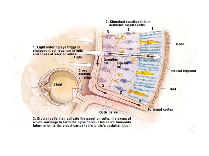 The rods an cones n n The retina, lining the back of the eye, consists of ten layers of cells containing photoreceptors (rods and cones) that convert the light waves to neural impulses through a photochemical reaction. Aside from the differences in shape suggested by their names, rod and cone cells contain different light-processing chemicals (photopigments), perform different functions, and are distributed differently within the retina. Cone cells, which provide color vision and enable us to distinguish details, adapt quickly to light and are most useful in adequate lighting. Rod cells, which can pick up very small amounts of light but are not color-sensitive, are best suited for situations in which lighting is minimal. Because the rod cells are active at night or in dim lighting, it is difficult to distinguish colors under these circumstances. Cones are concentrated in the fovea, an area at the center of the retina, whereas rods are found only outside this area and become more numerous the farther they are from it. Thus, it is more difficult to distinguish colors when viewing objects at the periphery of one’s visual field.