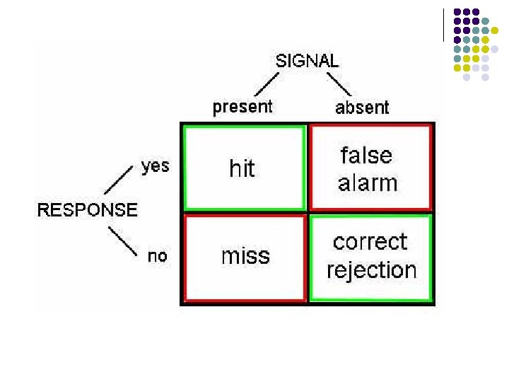 4 possible outcomes in SDT 1. 2. 3. 4. Hit- Detecting signals that are present Miss- failing to detect signals when they are present False Alarm – detecting signals when they are not present Correct Rejections – not detecting signals that are absent