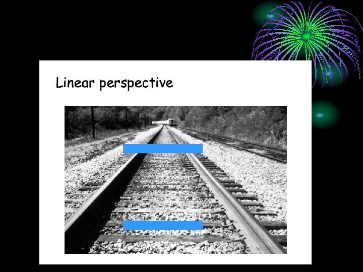 • 2. Relative Size - if we know that two objects are similar in size, the one that looks smaller is farther away (size constancy) • 3. Relative Height things higher in our field of vision look farther away • 4. Linear Perspective Parallel lines seem to converge with distance