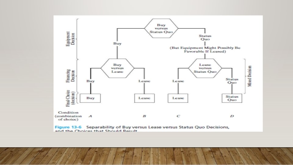 LEASE, BUY AND STATUS QUO DECISION • Leasing of assets is a business arrangement that makes assets available without incurring initial capital investment costs of purchase. • Lease specifications are generally detailed in a formal written contract.