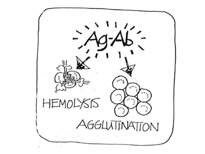 Antigen-Antibody reaction • Red cell Ag-Ab reaction can be detected by a number of techniques • Most frequently used – Hemolysis • Occurs if the entire complement sequence is activated following Ag-Ab interaction • Frequently stops at C 3 – no lysis • In vitro, lysis of RBC’s rarely occurs. – Agglutination • Used as indicator of Ag-Ab reaction