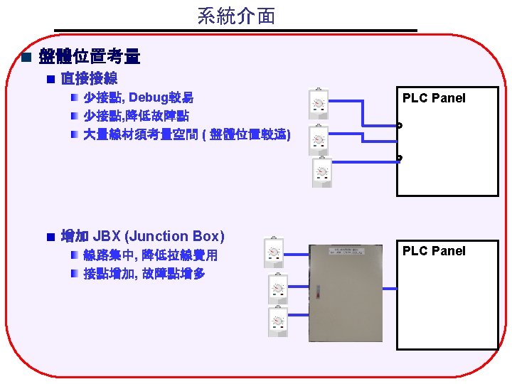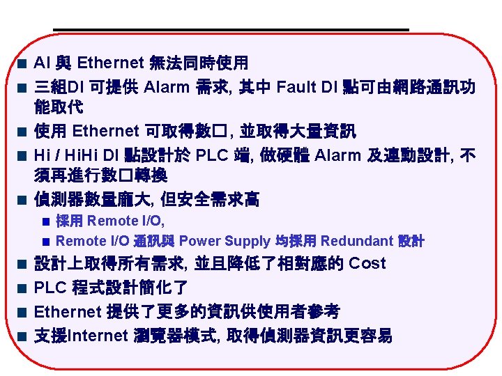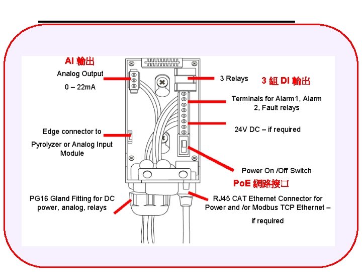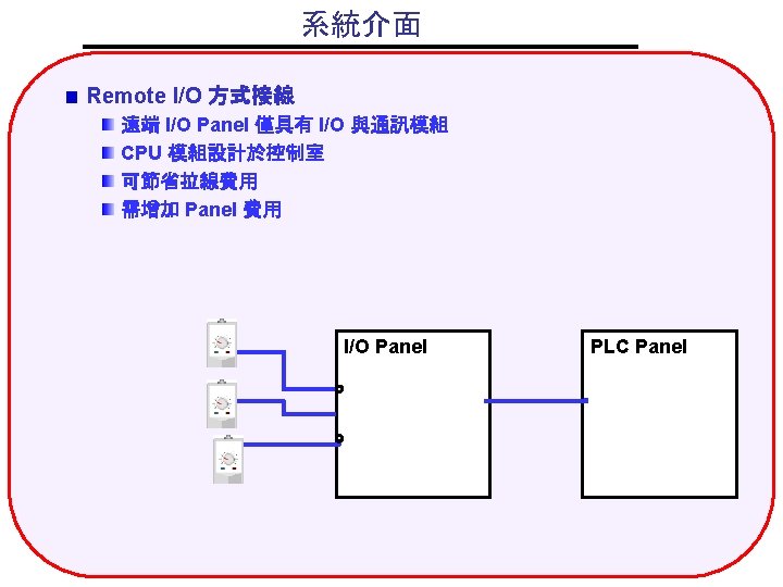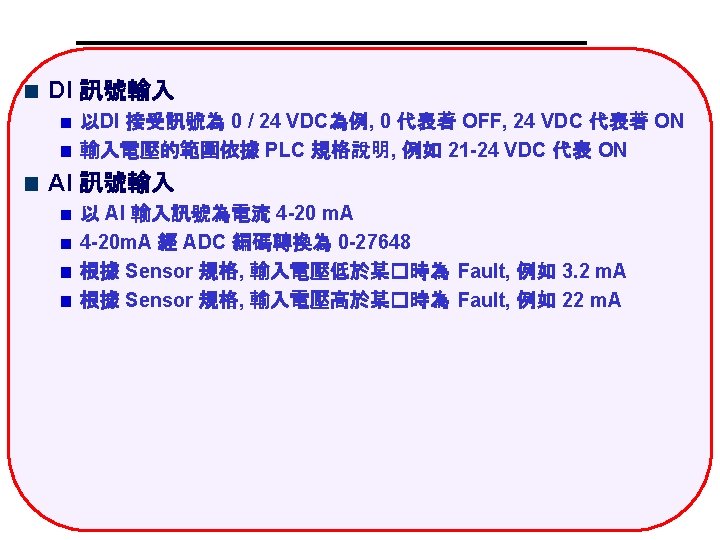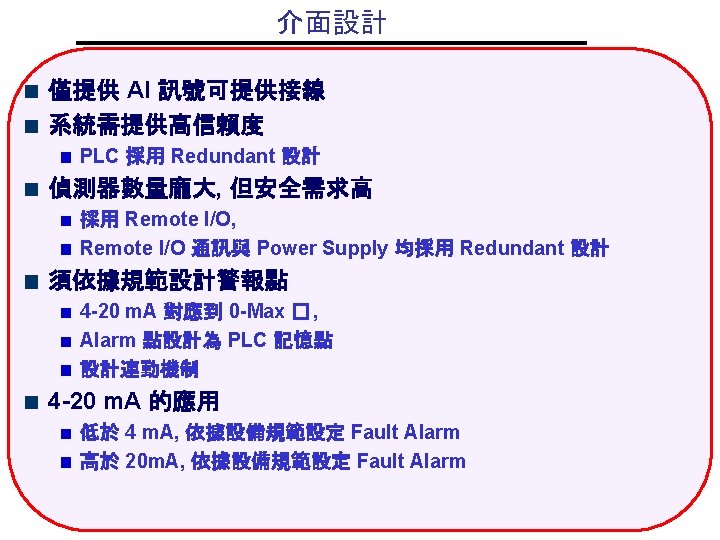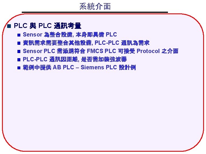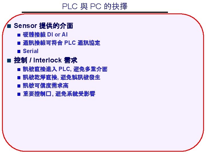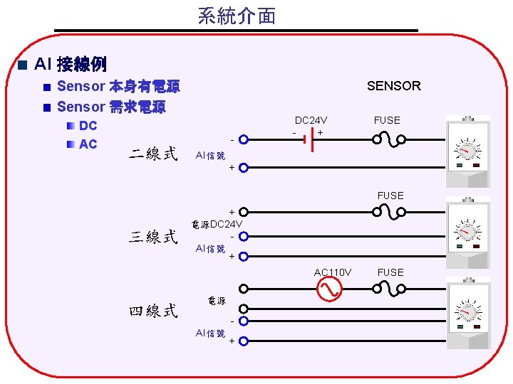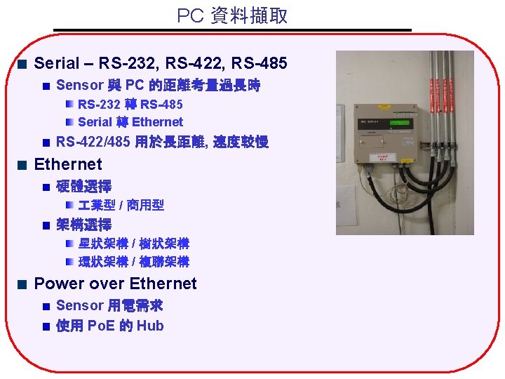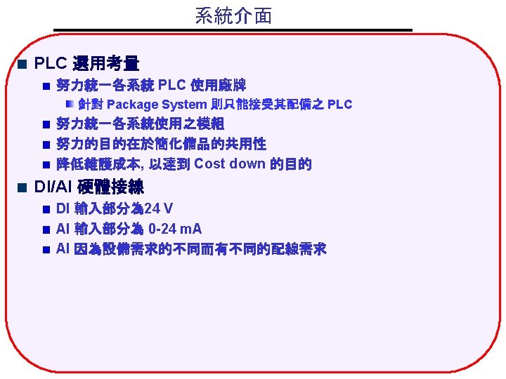 系統介面 硬體資料介面 Sensor 與 PLC 硬體線路 AI 硬體線路 DI 硬體線路 PLC 與 PLC 通訊線路 通訊資料介面 Sensor 與 PC 通訊介面 Serial 通訊介面 RS-422/485 RS-232 Ethernet 通訊介面 Ethernet Power over Ethernet (Po. E)