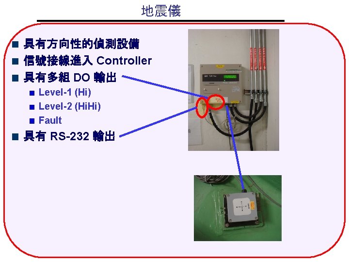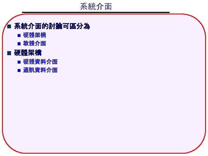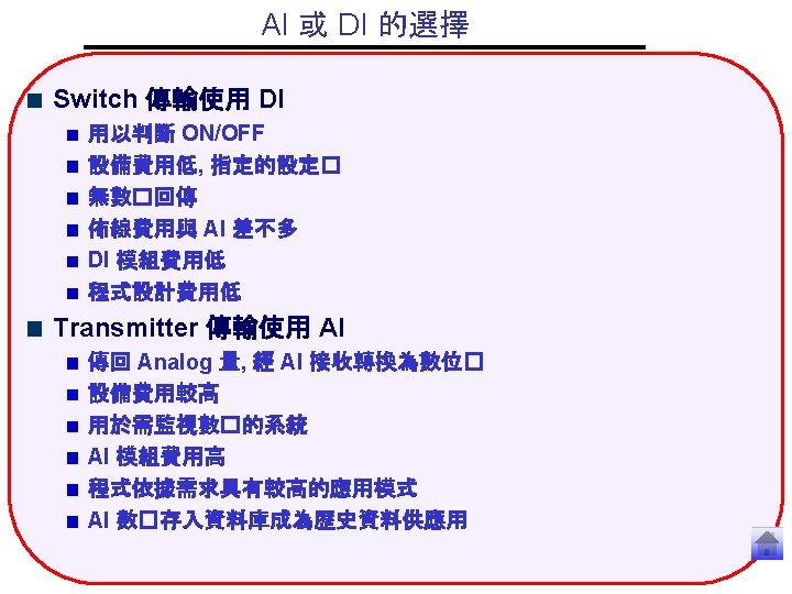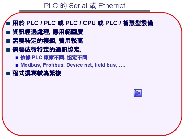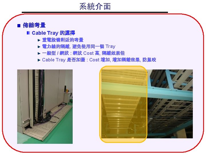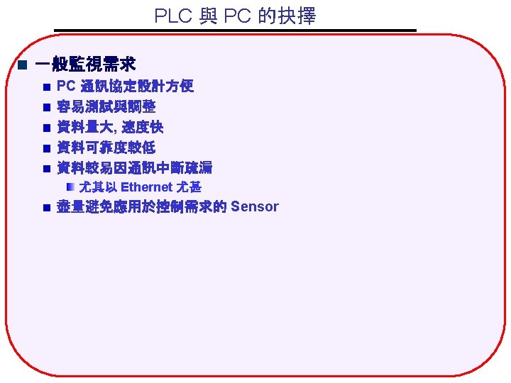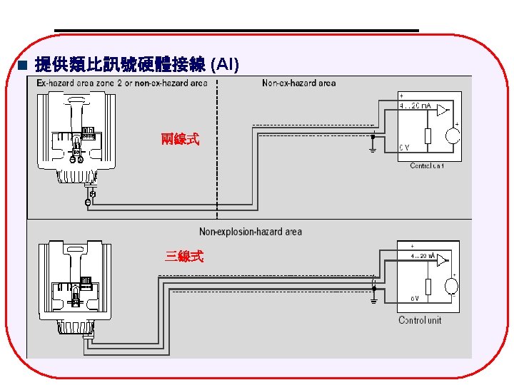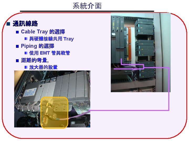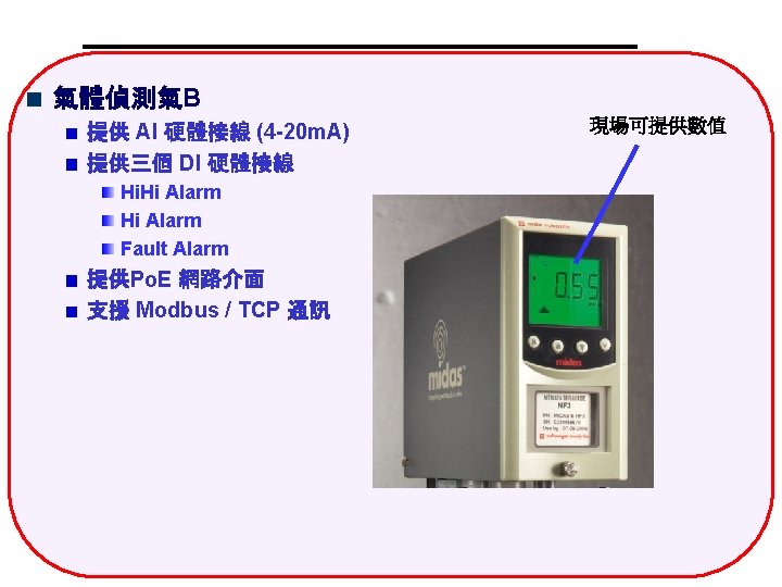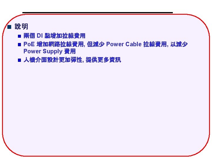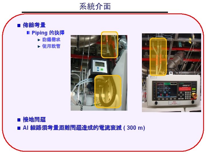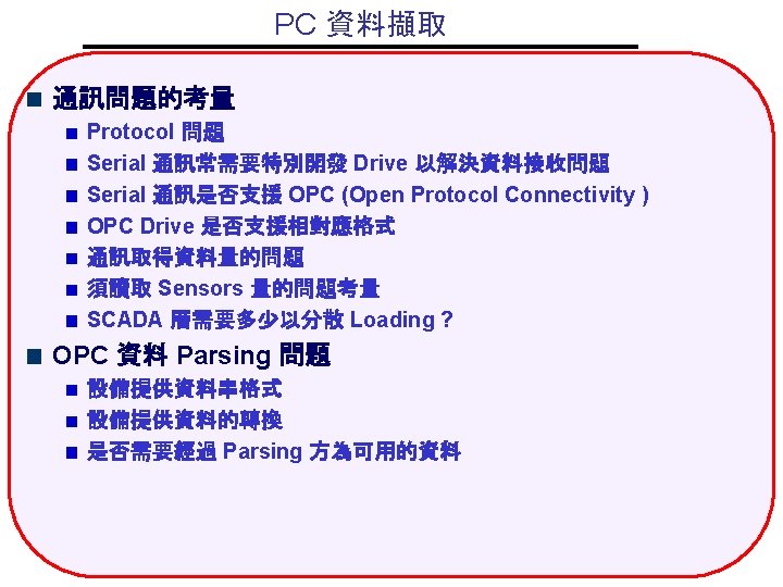 系統介面 硬體資料介面 Sensor 與 PLC 硬體線路 AI 硬體線路 DI 硬體線路 PLC 與 PLC 通訊線路 通訊資料介面 Sensor 與 PC 通訊介面 Serial 通訊介面 RS-422/485 RS-232 Ethernet 通訊介面 Ethernet Power over Ethernet (Po. E)