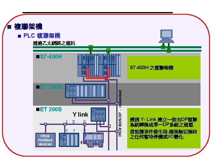 網路設計模式 – 樹狀結構 110 VAC Ethernet GD Hub Switch HMI for GD Ethernet GD GD HMI 110 VAC Ethernet GD Hi/Hi. Hi DC 24 V 訊號線 GD PLC GD 偵測器固定盤
