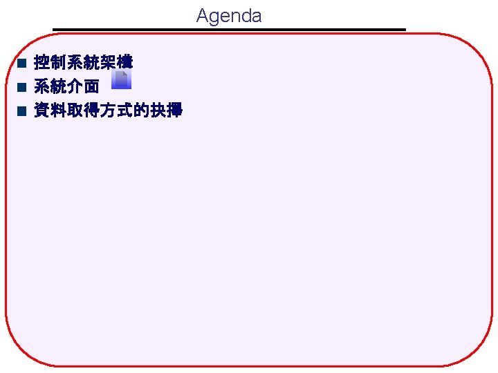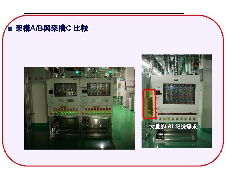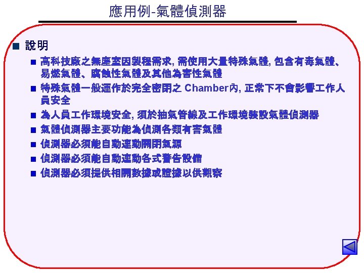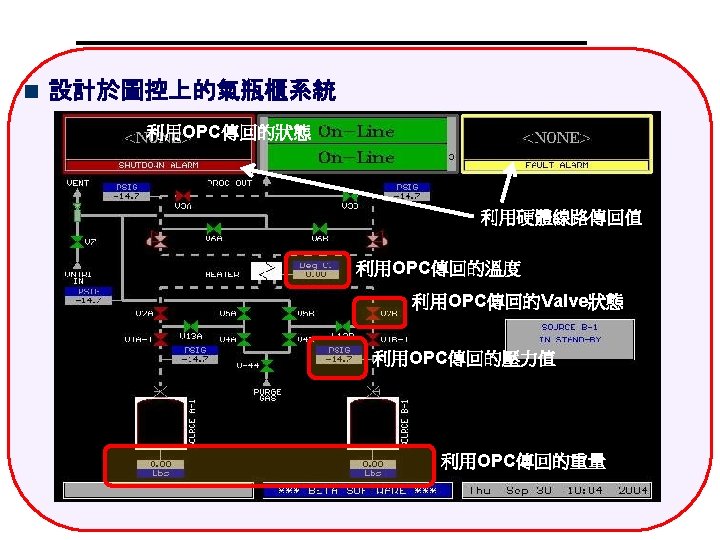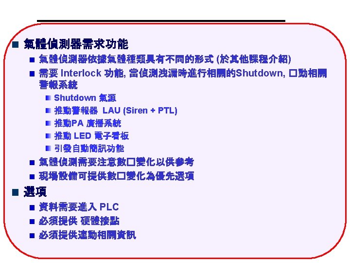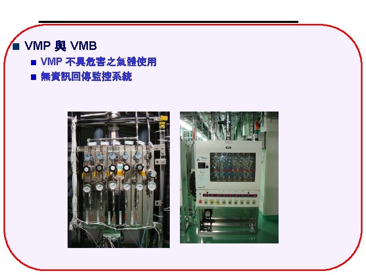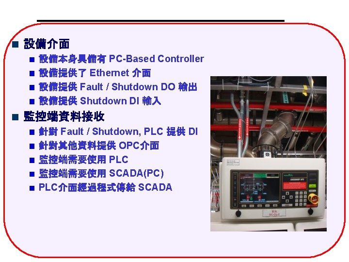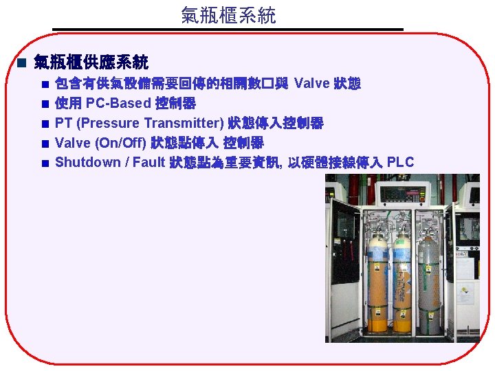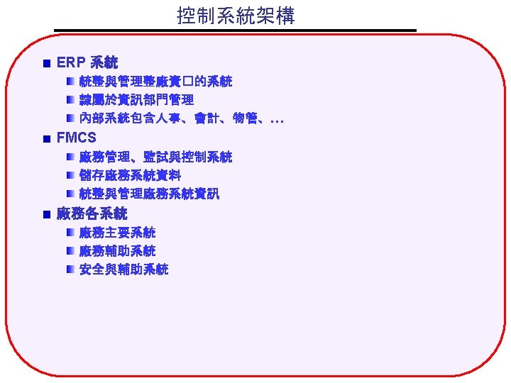 控制系統架構 分層系統 MIS Management Information System FMCS Facility Monitoring & Control System Facility Management & Control System Facility Systems Water treatment system (UPW/WT/REC…) Power system (MRT/CPS/DPUS/GEN/Local Station) Interface Gas Supply (Bulk Gas / Special Gas) Chemical Dispense Clean room system(HVAC/Exhaust) Mechanical/Electrical/Peripheral( PCW/PV/HV/HVAC…) Peripheral(PA/Fire/Vesda/Security/CCTV…) ERP 系統 廠務管理 (DB) View SCADA Controllers Sensors Equipment