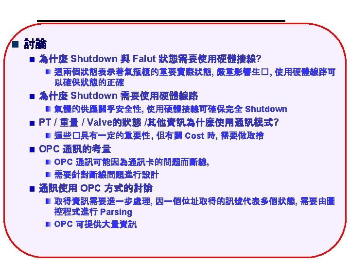 架構圖 DI x 1 氣瓶櫃 Hub DO x 1 PLC DO DO x 2 DI x 2 PLC DI 通訊介面 Controller Layer CPU SCADA View Layer View