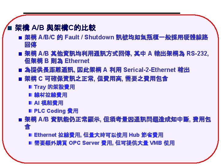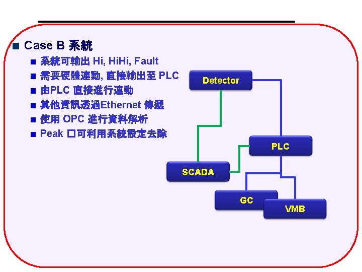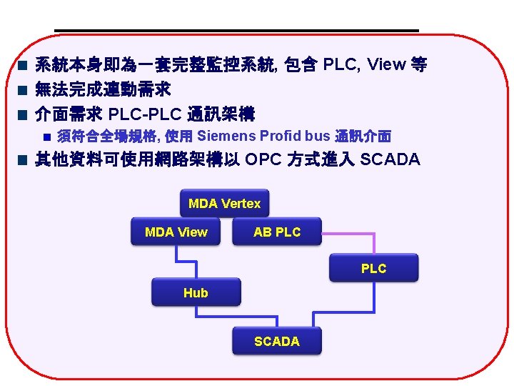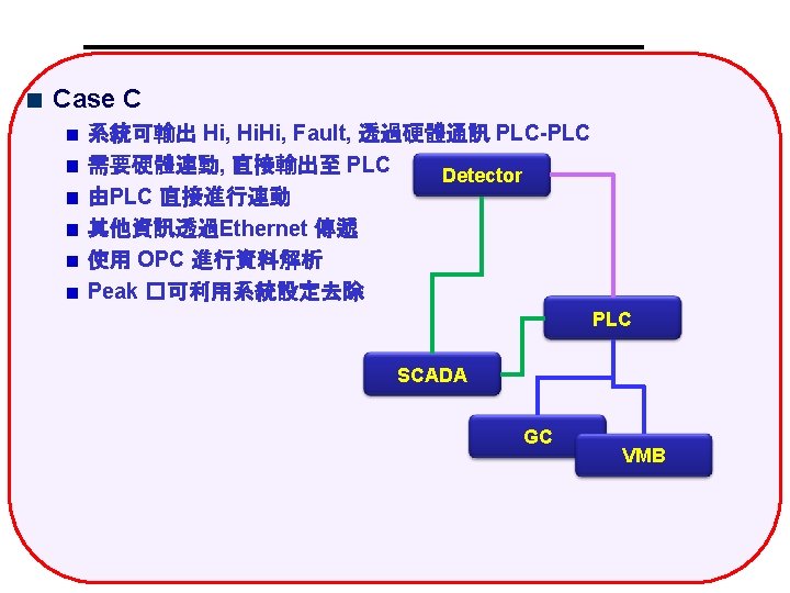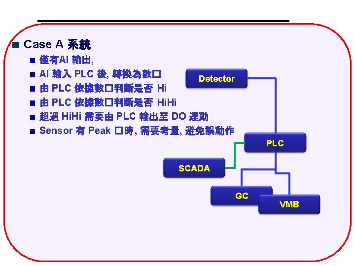 架構圖C –硬體線路 AI x 9 VMB DO x 1 or DO x 9 DI x 2 PLC AI PLC DO PLC DI 通訊介面 SCADA Controller Layer CPU View Layer View