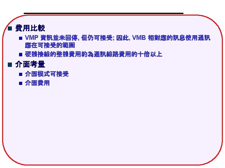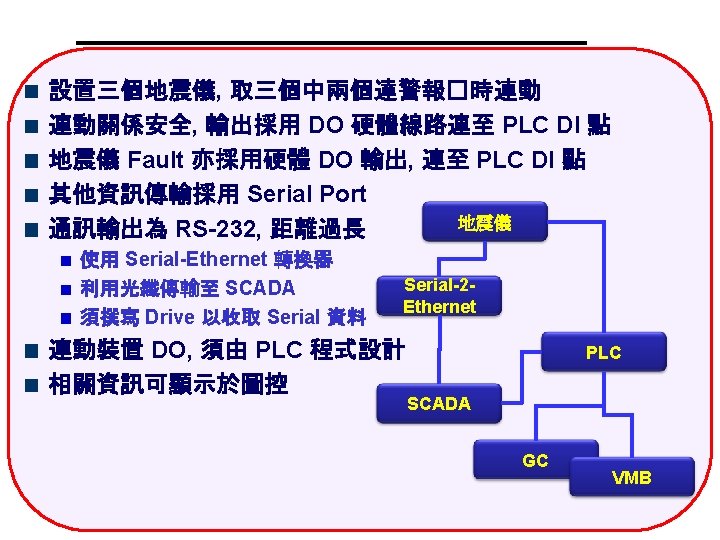 VMB 系統 架構圖A – 通訊架構 (RS-232) VMB DO x 1 or DO x 9 DI x 9 DO x 2 PLC DO Serial 2 Ethernet Hub DI x 2 PLC DI 通訊介面 SCADA Controller Layer CPU View Layer View