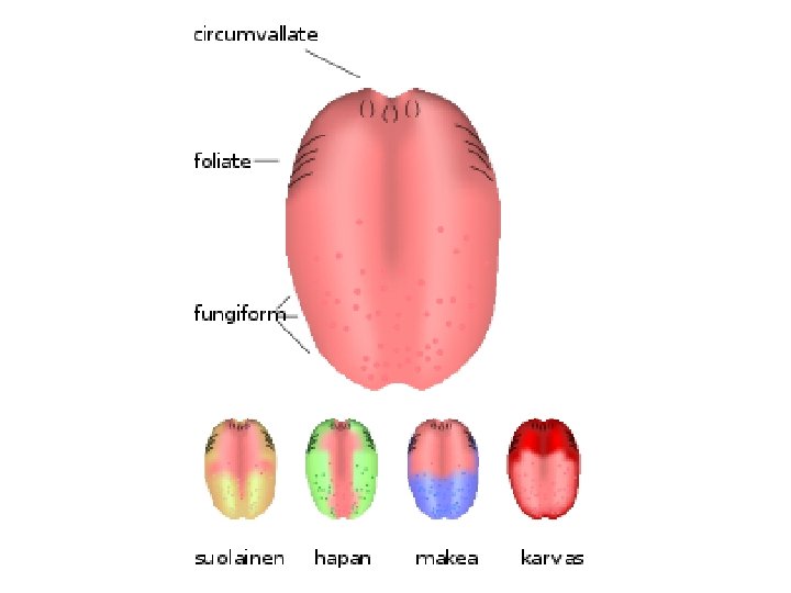 SENSORIIKKA (2) HUOMIOITAVAA AIVOHERMO Primaari aistimus → Kieli ulkona suusta Sekundaariaistimus → Maun maistelu suussa Tertiäärinen aistimus → Nielaisun jälkeen Suolainen Kielen oikea ja vasen laita Kielen kärki VII (n. facialis/ kasvohermo) Makea Kielen kärki VII Hapan Kielen oikea laita Kielen vasen laita VII Karvas Kielen takaosan makunystyt VII Huom! Kielikartta on vain viitteellinen