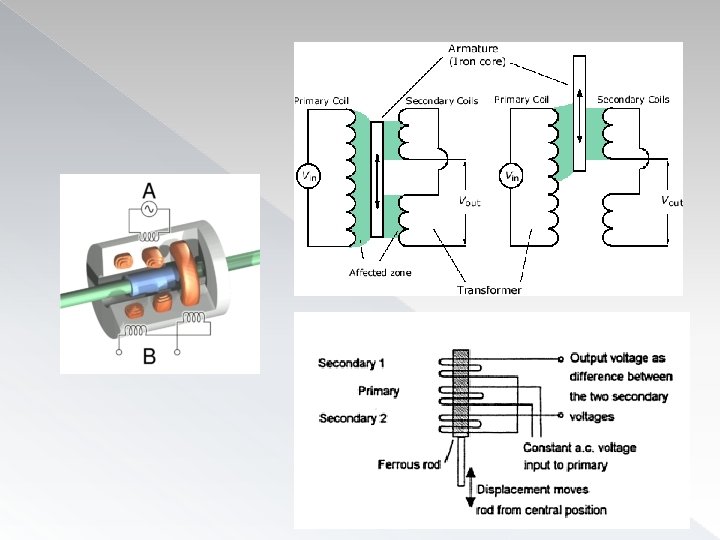 LVDT – linear variable differential transformer � LVDT is mainly used for displacement or position measurement. � It consists of three coils symmetrically spaced along a insulated tube. � The central coil is primary coil and other two secondary primary coils are in series whose end terminals act as outputs. � A magnetic core is moved through the central tube as a result of displacement being monitored.