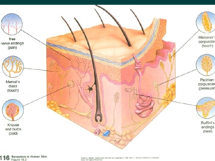 Thermal Receptors Ø Warm receptors • sensitive to temperatures above 25 o. C (77 o F) • unresponsive to temperature above 45 o. C (113 o. F) Ø Cold receptors • sensitive to temperature b/t 10 o. C (50 o. F) & 20 o. C (68 o. F) Ø Pain receptors • respond to temperatures below 10 o. C • respond to temperatures above 45 o. C