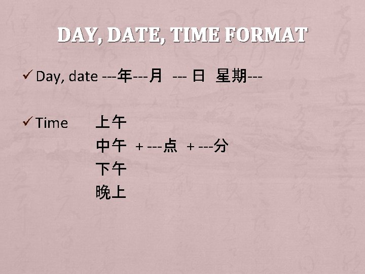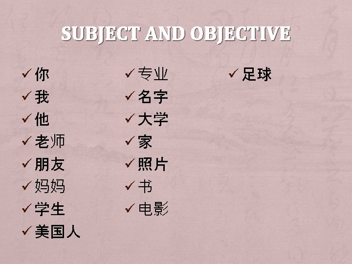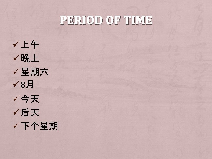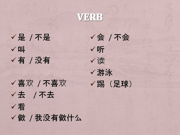 NEGATIVE SENTENCE Ø Subject + (Period of time) + NO 不+ verb + (objective)。 他不是我的老师。 Ø (Period of time) + subject + NO 没+ verb + (objective)。 我没有哥哥。