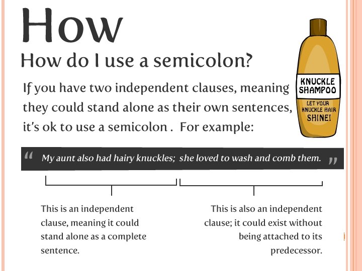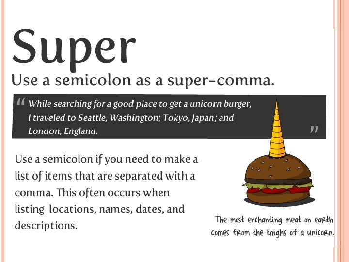 COLONS To introduce an explanation, an example, or a summary Princeton, New Jersey, is a hub of intellectual activity: it is home to Princeton University, the institute for Advanced Study, and numerous research centers.