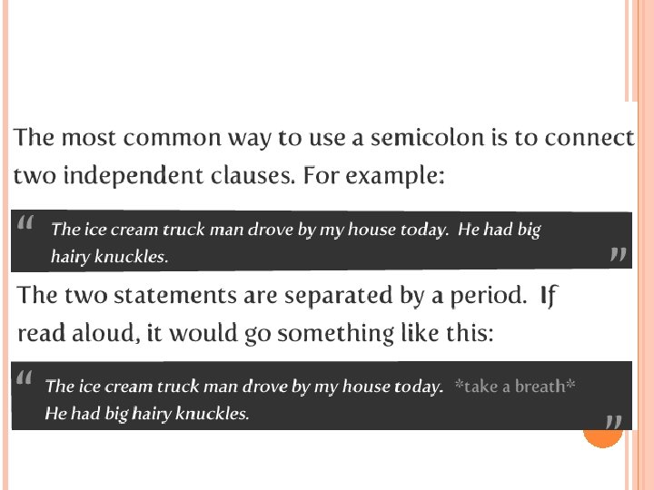 COLONS To introduce a lengthy or heavily punctuated quotation (more than two lines or contains two or more commas) The instructions were confusing: “After adjusting toggles A, B, and C, connect bracket A to post A, bracket B to post B, and bracket C to post C, securing with clamps A, B, and C, as illustrated in figure 1. ”