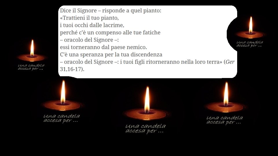 • Signore, mi rivolgo a te, con il cuore gonfio di dolore per la morte di… non mi è dato di rivolgere al suo corpo un ultimo saluto, né posso dargli un ultimo sguardo per salutarlo, ti prego per lui/lei: non sappiamo come gli/le hai parlato nel profondo della sua coscienza, ma certi del tuo amore, ti ringraziamo per tutto quello che hai fatto per lui/lei. Ora ti prego di accoglierlo/la presso di te, donagli quella pace che qui con noi ha appena assaporato, riempilo di quell’amore che con noi ha condiviso, avvolgilo della tenerezza con cui lui/lei ha sostenuto noi. Dona anche a me e a noi tutti di continuare a fidarci di te giorno dopo giorno, nonostante la tristezza della separazione dagli affetti che costruiamo a fatica nella nostra vita. Li affidiamo a te, amante della vita, Signore del tempo che vivi per sempre. Amen.