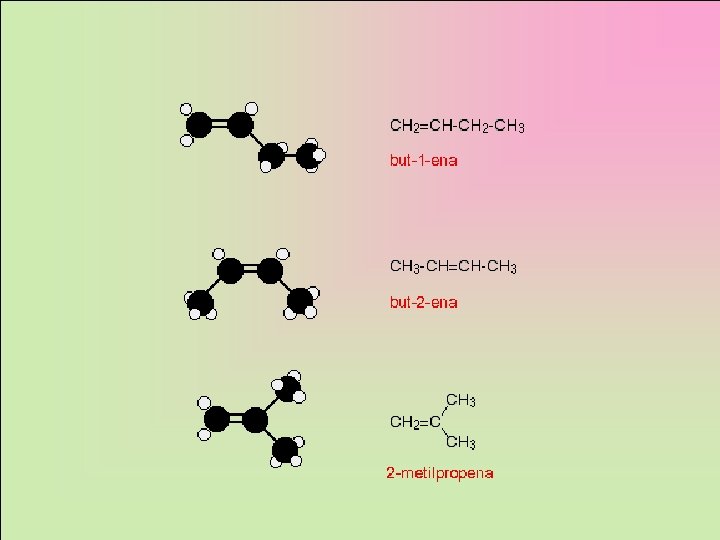 Tata Nama Alkena: 1. Rantai utama harus terpanjang dan mengandung ikatan rangkap. 2. Penomoran pada rantai C induk dimulai dari ujung yang terdekat dengan ikatan rangkap. 3. Rantai utama diberi nama dengan akhiran ena. 4. Jika pada alkena terdapat dua atau tiga ikatan rangkap, maka pada nama diberi akhiran diena atau triena. Contoh: C 4 H 8 memiliki 3 isomer struktur H 2 C = CH – CH 2– CH 3 1 -butena H 3 C - CH = CH– CH 3 2 -butena H 2 C = C – CH 3 2 -metilpropena I CH 3