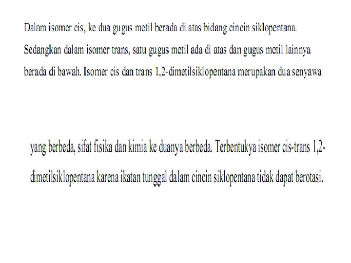bila gugus yang sama sepihak : bentuk cis bila gugus yang sama berseberangan : bentuk trans • Selidiki apakah senyawa berikut memiliki isomer cis-trans ? a. 2 - butena b. 2 -metil 2 -butena c. 2, 3 dimetil 1 - pentena d. 3 - heksena e. 4, 4 - dimetil 2 - pentena