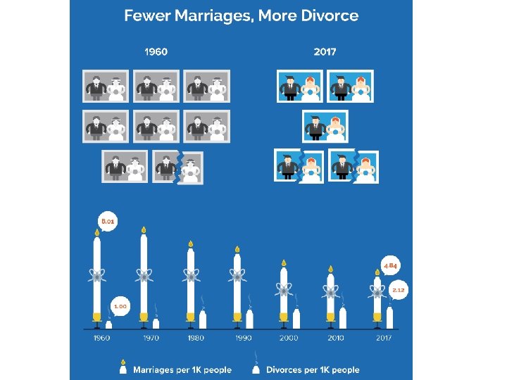 Expectativas muito altas Ronald Fletcher: as pessoas esperam mais do casamento e da vida familiar do que costumavam fazer. William Goode: o casamento tornou-se uma ocorrência por razões mais emocionais. Os casais não estão mais preparados para fazer parte de "casamentos emocionalmente vazios". Portanto, o divórcio é mais comum. No passado, as pessoas se casaram por razões práticas, e o fato de que os parceiros não se amaram não era um problema. Allan and Crow (2001): Recentemente o casamento é mais um relacionamento do que um acordo. Os casais procuram amor, satisfação e compromisso e reconhecem que o casamento não precisa ser um relacionamento que dura para sempre.