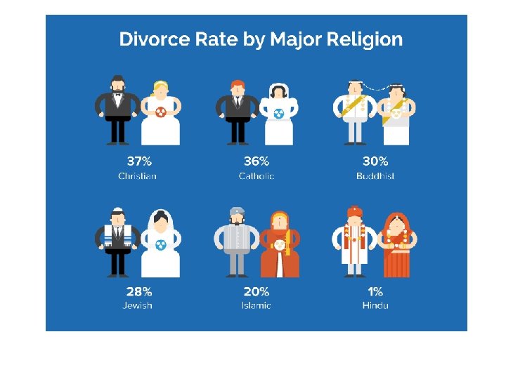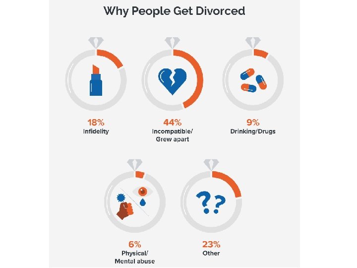 Quem se separa? Classe social: divorcio é comum em todas as classes sociais mas com a menor classe social do marido a probabilidade de divórcio aumenta O desemprego, a dependência dos benefícios e a baixa renda estão todos ligados a altas taxas de divórcio. Idade: divorcio é comum em todas as idades mas casais que casam jovens são mais propensos a se divorciar Os segundos casamentos são mais propensos a terminar em divórcio do que os primeiros casamentos. Os casais com classe, etnia ou religião mistos podem ter mais problemas conjugais. Esses casais podem ter menos em comum e experimentar a falta de aceitação de suas famílias.