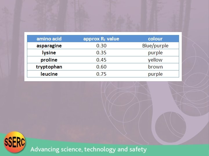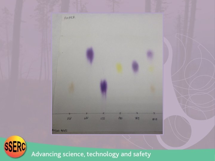 Ninhydrin – harmful if swallowed. Skin, eye and respiratory irritant. NOT a carcinogen. Spray in fume cupboard; wear goggle and gloves Some amino acids are irritant and harmful – those in protocol are low risk Risk assessment A risk assessment should be carried out by the technician preparing the chemicals and by the teacher supervising pupils carrying out this activity.