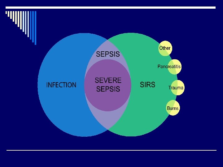Sepsa a SIRS je vo vzťahu k sepsi Vysoko senzitívny- 100% pacientov so sepsou má známky SIRS Nízko špecifický- SIRS má i iné etiologie než infekčné Sepsa= podskupina SIRS kde vyvolávajúcim inzultom je infekčné agens Ďalšie príčiny SIRS: Trauma Popáleniny Pooperačné stavy Akutna pakreatitida iné