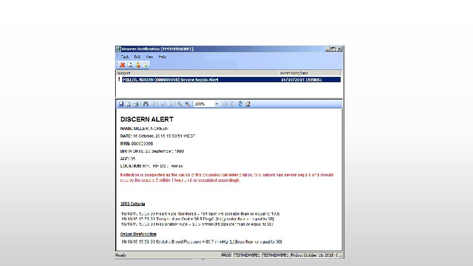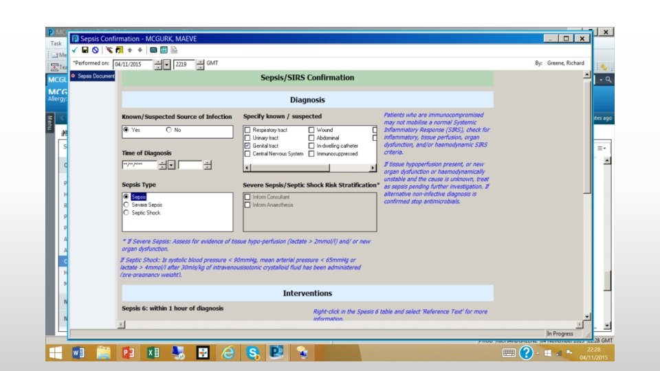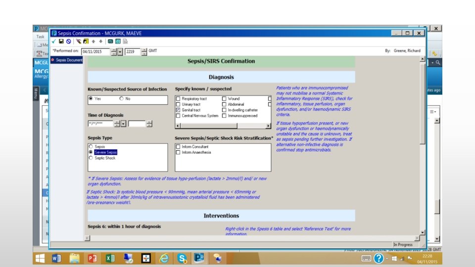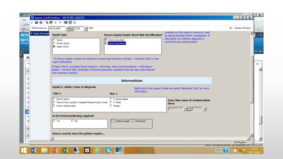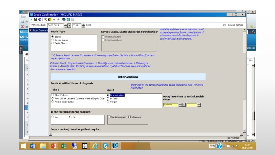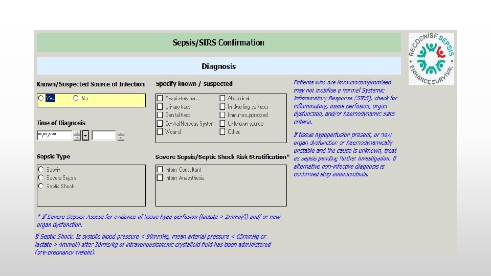 Sepsis Alert and Clinical Decision Support • Should aid early recognition of Sepsis • Especially in a low risk group where sepsis is more likely to be ‘missed’ • Will enhance response to a diagnosis of sepsis • Alerts and support orientated documentation • Will allow audit of sepsis in maternity services • Will allow assessment of the criteria which have not been validated for maternity patients